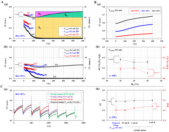 Dynamic characterization of the disposable suction pump with respect to hematocrit (Hct) and cavity volume (Vcavity). (A) Temporal variations of the averaged image intensity (<I>) and averaged blood velocity (<U>) with respect to Hct and Vcavity; (a) Temporal variations of <I> and <U> for blood (30% hematocrit) by varying the cavity volume. Three factors (SA, SB, and SC) are calculated from the temporal variations of <I>; (b) Temporal variations of <I> and <U> for blood (50% hematocrit) with respect to Vcavity; (B) Quantitative evaluation of the aggregation index (AI) and Erythrocyte-sedimentation-rate Aggregation Index (EAI) with respect to Hct; (a) Temporal variations of <I> were obtained by varying the hematocrit (Hct) (Hct = 30%, 40%, and 50%) at a fixed cavity volume of Vcavity = 0.1 mL. Temporal variations of <I> are obtained after resetting t = 0 at a minimum value of <I> (Figure 2A(a)); (b) Variations of the AI and EAI with respect to hematocrit. Time duration (ts) is fixed at ts = 400 s for calculating the three factors. Using the three factors, the AI (i.e., RBC aggregation effect) and EAI (i.e., ESR effect) are calculated as AI = SA/(SA + SB) and EAI = SA/SC, respectively; (C) Performance comparison between proposed pump and commercial syringe pump; (a) Temporal variations of averaged image intensity (<I>) depending on the proposed pump and syringe pump; (b) Variations of AI and EAI with respect to proposed method (i.e., Vcavity = 0.2 mL) and syringe pump (i.e., Q = 0.5 mL/h, 1 mL/h, and 2 mL/h).