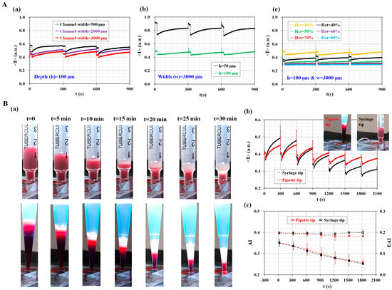 Quantitative evaluation of the effect of channel width (W), channel depth (h), hematocrit (Hct), and conical pipette tip on RBC aggregation measurement. (A) Characterization of the effect of channel width, channel depth, and hematocrit on performance; (a) Temporal variations of <I> with respect to channel width (W) (W = 500 µm, 2000 µm, and 3000 µm); (b) Temporal variations of <I> with respect to channel depth (h) (h = 50 µm and 100 µm); (c) Temporal variations of <I> with respect to hematocrit (Hct) (Hct = 30%, 40%, 50%, 60%, 70%, and 80%); (B) Quantitative comparison between syringe tip and conical pipette tip. (a) Sequential snapshot images over time (t) (t = 0, 5 min, 10 min, 15 min, 20 min, 25 min, and 30 min); (b) Temporal variations of <I> with respect to pipette tip and syringe tip; (c) Temporal variations of AI and EAI with respect to pipette tip and syringe tip.