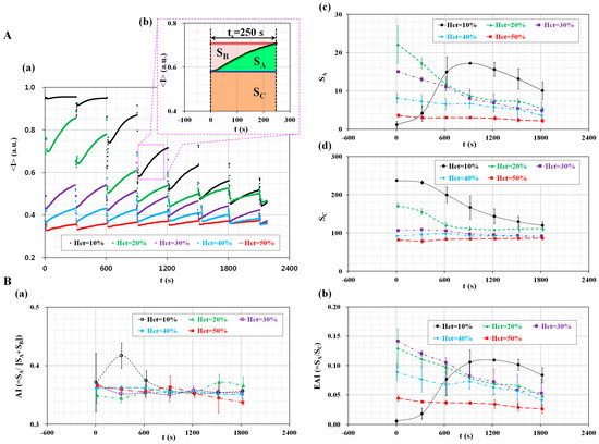 Quantitative evaluation of the effect of hematocrit (Hct) on RBC aggregation and ESR. (A) Temporal variations of SA and SC with respect to Hct; (a) Temporal variations of <I> with respect to Hct; (b) Three factors (SA, SB, and SC) are calculated by integrating the temporal variations of <I> for a specific duration of ts = 250 s; (c) Temporal variations of SA with respect to Hct; (d) Temporal variations of SC with respect to Hct; (B) Temporal variations of AI and EAI with respect to Hct; (a) Temporal variations of AI with respect to Hct; (b) Temporal variations of EAI with respect to Hct.