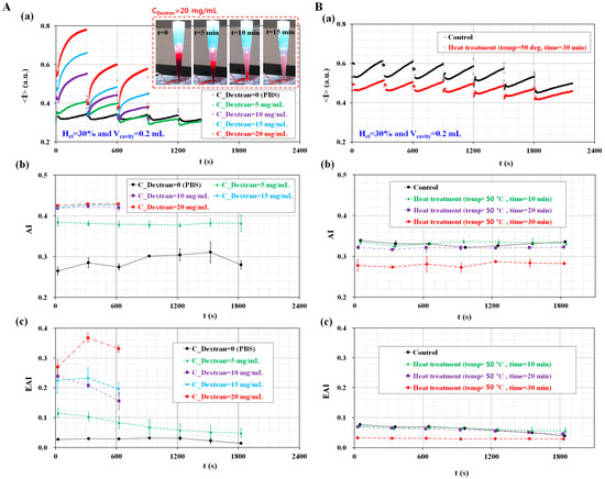 First, the aggregated blood was prepared by adding normal RBCs into a specific concentration of dextran solution (CDextran) (CDextran = 0, 5 mg/mL, 10 mg/mL, 15 mg/mL, and 20 mg/mL). Figure 5A shows the effect of the dextran solution on variations in the AI and EAI over time. As shown in Figure 5A(a), the variations in <I> were obtained by increasing the concentration of the dextran solution. For aggregated blood with CDextran = 10, 15, and 20 mg/mL, the blood flow was continued up to 900 s. The variations of <I> were quantified for 900 s. However, for the aggregated blood with CDextran = 0 and 5 mg/mL, the variations of <I> were quantified for approximately 1800 s, because the blood flow continued for approximately 1800 s.