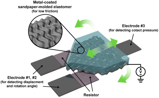 In this study, we developed a simple sandpaper molded elastomer-based triple electrode sensor that can discriminate simultaneously between displacement, rotation angle, and applied tactile pressure (see Figure 1). When displacement and rotation were applied, they were detected by the difference in the resistance change, coming from the change in contact area, between two separate electrodes (electrode no. 1 and no. 2) both making contact with the metal-coated sandpaper-molded elastomer. The undulating surface structure provided by the sandpaper structural mold reduces the friction between the contacting electrodes considerably, allowing the sensor to operate without affecting the measured output. When external pressure was applied, all three of the electrode contact areas increased, making contact pressure detection possible. Our sensor showed a minimum 0.25 mm−1 of displacement sensitivity with a ±33 μm accuracy, a minimum 0.027 degree−1 of rotation sensitivity with ~0.95 degree of angular accuracy, and a 4.96 kP−1 of pressure sensitivity. We also show that it is possible to monitor human joint movements using our sensor by demonstrating the detection of the up-and-down tilting motion of a human forefinger and the bending and straitening motion of a human elbow. With further developments, the sandpaper molded elastomer sensor may become a low cost, facile, and reliable alternative to the highly cumbersome and high cost sensors that are currently used.