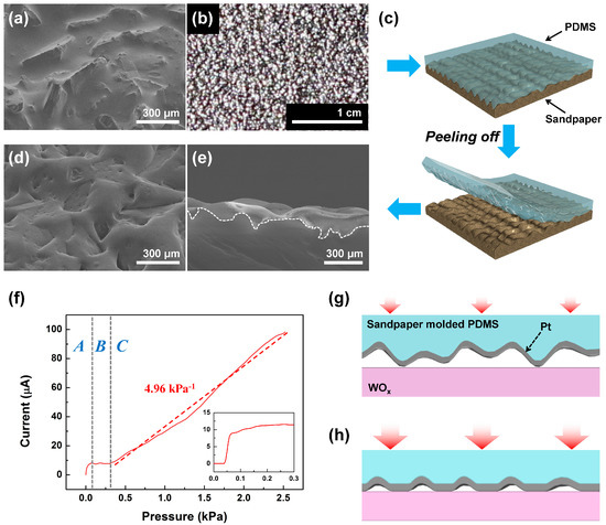 The sandpaper molded PDMS (SMP); (a) The SEM image and (b) the optical image of a sandpaper with a grit size of 80 (CAMI grit designation); (c) the molding process of SMP; (d) the oblique angle and (e) cross-sectional SEM images of SMP, where the white dashed line shows the cross-sectional boundary; (f) the pressure dependent output current of a basic tactile sensor based on the SMP at an applied bias of 10 mV, where the inset shows the expanded output characteristics of another sensor, and the schematic illustrations of SMP tactile sensor in region (g) A and (h) C in Figure 2f.