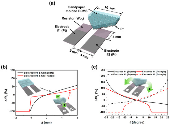 Previously reported tactile sensors using microstructure deformation did demonstrate that they can sense not only pressure but also shear and torsion, which may be used to determine displacement and rotation angle [15,16,17,18]. However, this was just a demonstration of the fact that the various external stimuli produce changes in the sensor output, not that the sensor was operating simultaneously as a pressure, shear, and torsion sensor. More fundamentally, due to the sensor structure and contact configuration, these sensors are not able to discriminate between the external contact pressure, shear, and torsional stimuli. To make a distinction between the external stimuli, we designed a dual electrode SMP (dSMP) sensor structure as shown in Figure 3a. This sensor is composed of two lower 80 nm thick WOx resistors with 80 nm thick Pt electrodes and a triangular SMP making contact. The distinction between displacement and rotation angle was made simply by comparing the output currents from the two electrodes. When displacement or rotation is applied, it changes the contact area, and therefore the resistance, between the SMP layer and the two electrodes. Due to the arrangement of the electrodes, the resistance changes in unison during one-dimensional displacement motion and opposite to each other during rotational motion.