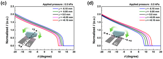 The top SMP needs to move back and forth and also rotate to detect displacement and rotation angle simultaneously, meaning that it requires two degrees of freedom: one translational and one rotational. This puts limitations on the accuracy of the sensor, since the SMP movement cannot be limited to a single axis. Therefore, possible measurement error depending on out-of-axis movements should be considered. Figure 4 shows the simulated effect of the out-of-axis movements of SMP on sensor detection results. We can see from Figure 4a,b that a lateral displacement of ±100 μm and a rotation of ±3 degrees would cause a displacement current measurement error of ±5%. Also from Figure 4c,d, we see that the parallel and lateral displacement error of both ±100 μm would cause the detected rotation angle to have an average ±10% error. This shows that it becomes necessary to limit the out-of-axis movement of the top SMP as much as possible while maintaining low contact friction between SMP and the contact electrodes. For this purpose, we have utilized an elastic casing to provide a vertical pressure point to act as a virtual rotation axis and to limit lateral movement of the SMP.