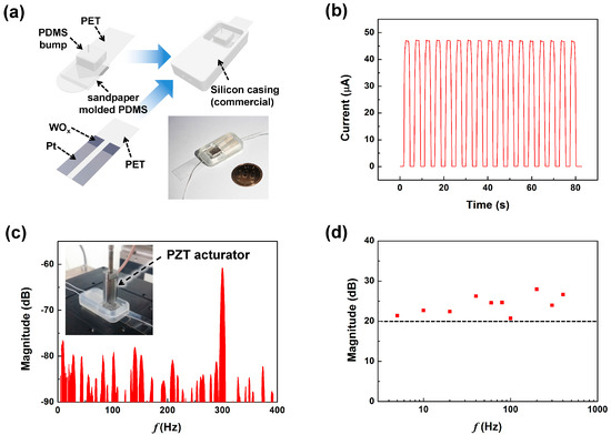 Figure 5a shows the assembly process of the dSMP sensor. For the upper layer, 30 nm of Pt was deposited on the SMP using a stencil mask, then the SMP was attached to a (3-aminopropyl)triethoxylsilane (APTES) treated PET film [23]. A PDMS bump, which acts as a vertical pressure concentrator, was attached to the opposite side of the PET film using the same method. The lower layer has two electrodes in parallel with the WOx making contact to the upper SMP layer. The two layers were placed within a commercial silicon elastic casing that kept the layers placed against each other with minimal pressure to maintain electrical contact and to act as the virtual rotational axis. The inset in Figure 5a shows the optical image of the completely fabricated dSMP sensor. The upper PET film protrudes from a gap placed at the end of the silicon casing, and functions as a lever for the application of external displacement and rotation. Figure 5b shows the output current of the dSMP sensor during repeated cycles of 1.5 kPa vertical pressure application. We observed that the output current variation in the loading state was about 0.53%. Such high stability was a result of the high reliability of the electrical contact between the top SMP electrode and the resistors. PDMS inherently shows a viscoelastic behavior which can cause a slow recovery and results in a hysteresis problem for typical tactile sensor applications [24,25]. Although our sensor was fabricated using PDMS, it showed fast response and recovery times of under 0.3 s. These characteristics were also shown in other reports using metal contacts on PDMS microstructures [18]. The frequency response was investigated by applying vibrational stimulus using a piezoelectric actuator, with 2 μm of free stroke, at the top bump structure, as shown in the inset of Figure 5c. The fast Fourier transform data of the dSMP sensor output by applying 300 Hz of vibrational pressure is shown in Figure 5c. The result shows that, from the sensor measurement data, it was possible to determine the frequency of the applied pressure of 300 Hz. The magnitude fluctuation observed under −80 dB at all frequency regions was assumed to be caused by white noise. Figure 5d shows the magnitude of the sensor output, which was obtained by subtracting the base line from the main peak [26], depending on the input vibration frequency between 5~400 Hz. The dSMP sensor showed a frequency response of over 20 dB at all measured frequencies.