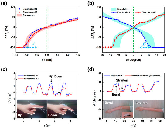 The displacement and rotation angle sensing characteristics of the dSMP sensor; the measured ΔI/I0 of the two lower electrodes depending on applied (a) displacement and (b) rotation. The pink area represents the simulated output variation, originating from a lateral position error of ±100 μm and a rotation error of ±3 degrees, and the cyan area represents the simulated output variation from an SMP position variation of ±100 μm; (c) human forefinger movement sensing result. The insets show the image of the up, and down motion of a human forefinger with the dSMP sensor attached to the proximal phalanx; (d) human elbow movement sensing result. The insets show the image of the eight degree bending and straitening motions of a human elbow with the dSMP sensor attached to the side of the elbow joint.