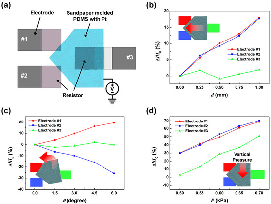 As demonstrated, the dSMP sensor was able to detect displacement and rotation angles simultaneously. However, to interpret the measurement data as was done above, it was required that the contact pressure at the SMP and bottom electrode remain the same. For application to realistic situations where external pressure may exist, the applied pressure to the contact area should be considered a variable and be monitored simultaneously as well. As configured, when external pressure is applied to the surface of the dSMP sensor, the result may be interpreted as a positive displacement. This limitation can be overcome by introducing an additional third electrode to the bottom electrode configuration. The schematic illustration of the triple electrode SMP (tSMP) sensor is shown in Figure 7a. An extra resistor on an extra electrode no. 3 were positioned opposite to electrode no. 1 and no. 2, with its resistor centered at the SMP position. The square resistor region was separated from the electrode region to maintain a constant contact area during SMP movement. The resistor only made electrical contact with the external contact area through Pt deposited on the back of the PET strip. For any movement the SMP makes the third electrode would maintain constant contact with this configuration. By measuring the current change at electrode no. 3, it will be possible to detect tactile pressures independently from the other electrodes. It can be seen in Figure 7b,c that for the displacement and rotation angles applied, the third electrode maintained a relatively constant current indicating that no additional pressure was applied to the sensor. When tactile pressure was increased from 0.5 kPA to 0.7 kPa, we can observe from Figure 7d that all of the electrodes showed an increase in current, indicating increased pressure at the contacts. The results demonstrate that the tSMP sensor was able to detect displacement, rotation angle, and tactile pressure simultaneously just by monitoring the change in electrode currents.