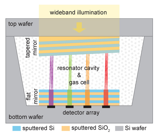 Figure 1. The resonator cavity also serves as a gas cell, where wavelength selection and optical absorption occur simultaneously. The wavelength to be transmitted through the filter is determined by the cavity length, i.e., the distance between the flat and the tapered mirror. Therefore, if the filter is fabricated on top of a detector array, each pixel measures a different wavelength. Furthermore, multiple reflections between the mirrors intensify the interaction between the light and the sample, thus elongating the effective optical absorption path beyond the physical dimensions of the cavity. When the cavity is filled with the sample, the intensity of the light transmitted through the filter decreases according to the spectral distribution of the sample absorption.