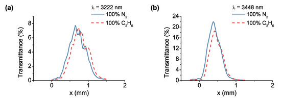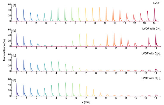 x-axis. This shift could be explained by the theoretical approach based on the Fizeau model, where absorption of the sample is incorporated. Including the effect of absorption in the calculation of the overall transmittance of the gas-filled LVOF using Equation (
