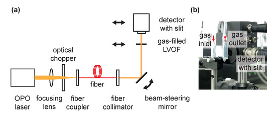 The output of the experimental OPO laser is focused on the fiber coupler, while passing through an optical chopper operating at 1.6 . After propagating through a single mode ZrF4 fiber, the light beam is collimated by an aspheric lens package with a focal length of resulting in a light beam with a diameter of 1 at a distance equal to the focal length of the lens. Measured full-angle beam divergence is 0.125, which falls within the full-cone angle limit of the gas-filled LVOF. The collimated light beam reflects off the beam-steering mirror that is aligned at the optimum incidence angle for the given filter-detector separation. After passing through the device, the light is collected at the large-area PbSe detector, on which a 3 -tall and 15 -wide slit is mounted to replicate a pixel in a detector array. The combination of a large-area detector and a slit is chosen over a detector array mainly due to the limited availability of an array in the mid-infrared range. Moreover, the constant width of a pixel in such an array could be a limiting factor in characterization, where the detector pixel must be narrower than the length that corresponds to the FWHM resolution of the filter to be able to construct the transmission curve. Using such a slit enables the collection of high-resolution data thanks to its narrow width, while maximizing the light throughput due to its height. The flow of both pure sample gas and nitrogen as the infrared-inactive diluting component through the filter cavity is regulated by mass-flow controllers at a rate of / in total.