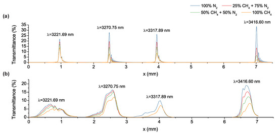 with pure nitrogen and methane as well as their mixtures. The reference transmission curve with nitrogen exhibits a peak transmittance of