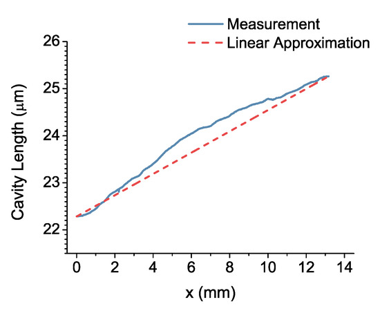 Figure 9a. Measured and simulated spectral responses are in good agreement in terms of the position of the transmission curves. Moreover, the variation in the peak transmittance of the curves in simulations, which is a consequence of the position-dependent reflectivity and the selection of a single optimum incidence angle, matches the characterization results. However, the measured transmission curves are significantly wider than their simulated counterparts, which is due to several practical aspects that have not been taken into consideration. Firstly, the measured profile of the mirrors used in the simulations accounts merely for the length of the cavity and the thickness of the tapered SiO