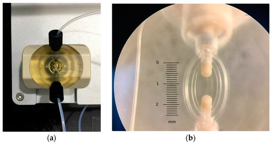 Pictures of (a) the measurement cell once assembled in the A20 platform, and (b) detailed view of the OSTEMER gasket with the flow chamber, including the flow terminal connections for the fittings.