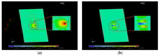 A numerical model of the sensor based on the finite element method (FEM) has been developed to simulate and optimize the electromechanical response of the acoustic wave microsensor prior to fabrication. A commercial software package (ANSYS, Canonsburg, PA, USA) has been used. In order to consider the piezoelectric nature of the AT-cut quartz wafer used as a substrate of the sensor, a multi-physics model has been built. Electric field and mechanical stress/strain have been calculated in the model. Degrees of freedom (DOF) of the model nodes include temperature, electric potential, and 3D displacement. Values for the physical properties of AT-cut quartz, which are described elsewhere [,,], are listed in Appendix A. These properties are obtained starting from those of the ‘mother’ quartz through rotation transformation formulas [].
