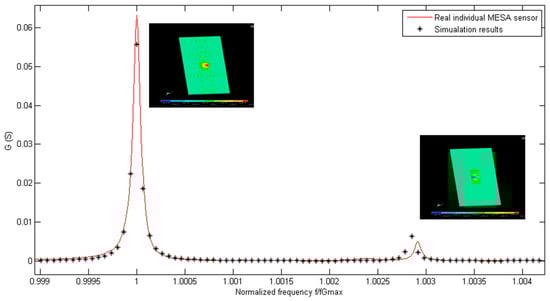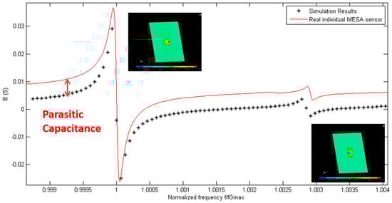 The electrical admittance spectrum of the implemented sensor has been acquired. The fundamental and the first inharmonic modes have been included in the frequency range of interest. The average fundamental frequency of a batch of 10 manufactured sensors in the air is 149,811,740 Hz, with a standard maximum deviation smaller than ±250 kHz. The experimental spectrum of the sensor admittance measured in air has been compared with the admittance calculated in the simulations. In Figure 6, a real part of the electrical admittance of the 150 MHz resonator is shown. The black points represent the simulation points at different excitation frequencies, while the red line represents the measured response by using a network analyzer. In Figure 7, the same information is included for the imaginary part of the admittance spectrum of the resonator. The frequency axis has been normalized in both figures for a better comparison of the vibration modes. By doing so, the tolerances in the fabrication process that can slightly affect the thickness of the inverted mesa section, and thus the experimental resonant frequency, are considered. Results show a very good agreement between experimental characterization and numerical predictions. This fact supports the different boundary conditions, meshing options, and assumptions e.g., “mass loading” theory [,,] considered during the development of the numerical model. The main difference between the experimental and numerical data is the offset found in the imaginary part of the admittance. This effect is due to the parasitic capacitance present in the real sensor, and is not taken into account in the model. This is explained by the unavoidable parasitic capacitance, in parallel with the sensor, introduced by the sensor cell. Nevertheless, this fact does not invalidate the model, and it will be considered in the following design steps.