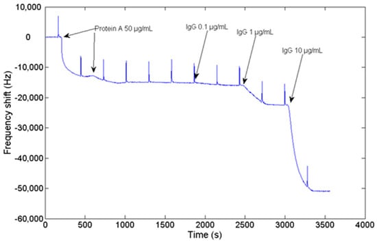 Frequency shift measured during the adsorption of Protein A over the surface of the sensor, and the subsequent injection of 0.1 μg/mL, 1 μg/mL and 10 μg/mL of IgG in the sensor cell.