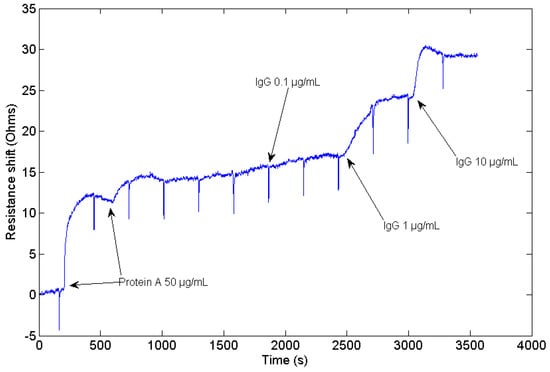Resistance shift measured during the adsorption of Protein A over the surface of the sensor, and the subsequent injection of 0.1 μg/mL, 1 μg/mL and 10 μg/mL of IgG in the sensor cell.