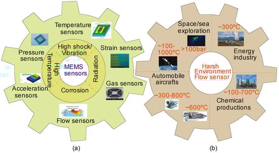 Micro-Electro-Mechanical Systems (MEMS) sensors such as pressure, temperature, strain, acceleration and flow are essential for many harsh environment applications. Harsh environments include but are not limited to high pressure, high temperature, corrosive and erosive nature that can hinder the operation of the device [1]. Figure 1a represents various MEMS sensors and the associated harsh environment conditions. These conditions are typically found in combustion optimization and emission control, oil industries, chemical process control, the propulsion systems of spacecraft and deep-sea devices [2,3]. In recent years, a number of flow sensors have been fabricated and characterized for the measurement of pressure [4,5,6], temperature [7,8], gas species [9,10,11,12,13], strain [14,15,16,17] and acceleration [18,19] in these environments. In addition, there has been growing demand for developing high-temperature miniaturized flow sensors with fast response times and low cost through mass fabrication. Figure 1b depicts the various applications of MEMS flow sensors and their operating ranges. For instance, automobile aircraft and propulsion system conditions are usually monitored by high temperature thermal sensors, which contribute to optimizing the operation conditions from 300 to 800 °C. In chemical production and oil and gas industries, where the operating temperature may range approximately from 100 to 700 °C, in-situ real-time monitoring of process parameters such as temperature, pressure and flow is indispensable as it contributes to the efficiency and process quality assurance [20]. Delivering science instruments through sulfuric acid clouds to land on the surface of space based environment such as Venus, where the pressure is more than 100 bar will inevitably require the use of MEMS flow sensors. Also, energy and automotive combustion systems require precise control of temperature, pressure and air-fuel ratio to obtain optimal efficiency and reliability [21].