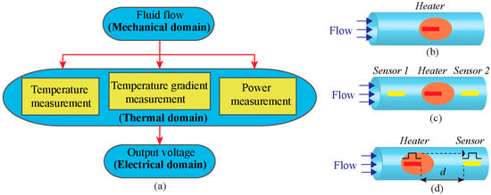 Thermal flow sensor, (a) Signal transduction path; (b) Hot-wire and hot-film configuration; (C) Calorimetric configuration; (d) Time of flight configuration.