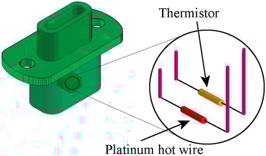 Hot-wire and hot-film sensors operate either in the constant power (CP) mode or in the constant temperature difference (CT) mode. CP mode detects the temperature change of the heater at a constant heating power. In CT mode, a servo-amplifier circuitry is used to establish a constant temperature between the probe and the ambient. Details about the use of these modes can be found in the literature [34,35,36,37,38,39]. As an early development, Toyota has developed a hot-wire flow sensor device, operated in CT mode in the fuel injection system. The amount of current supplied to hot-wire is proportional to the mass flow rate and the intake air temperature is monitored by a thermistor depicted in Figure 3. In this environment, hot-wire sensors are susceptible to dirt, smoke and oil particles present along with flow and subsequently the device leads to failure if contaminated.