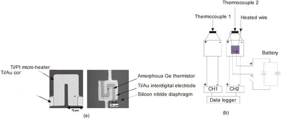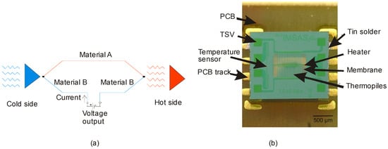 (a) Schematic illustration of a thermocouple; (b) Thermocouple based flow sensor reported by Sosna et al. [52] (Reprinted with permission from IEEE).