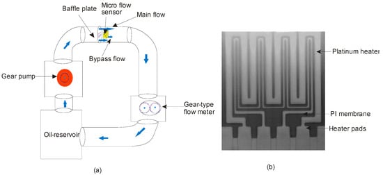 (a) Polymer-based microflow sensor for hydraulic systems; (b) Platinum heater on a Polyimide (PI) membrane reported by Aslam et al. [82] (reprinted with the permission from Sens. Actuat. Chem. B).
