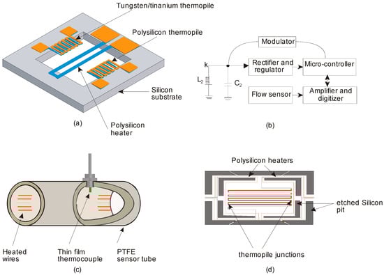 Examples of recently reported thermoelectric flow sensors, (a) A high-temperature thermal flow sensor with membrane, heater and thermopiles; (b) Hardware block diagram of the wireless flow sensor developed by Gould et al.; (c) Time of flight thermal flow sensor for large scale containment facility; (d) Top view of a thermal flow sensor showing reference and sample heaters along with five thermopile junctions on each side.