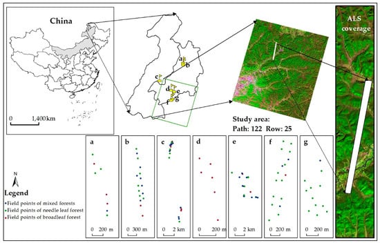 The geolocation of the study area was covered by a pseudo-color composite (R: band 5, G: band 4, B: band 3) Landsat ETM+ image (path: 122, row: 25) for 2012 with overlaid ALS coverage strip; Blue, Green and red points represented field points of mixed forests, needle leaf forest and broadleaf forest, respectively.