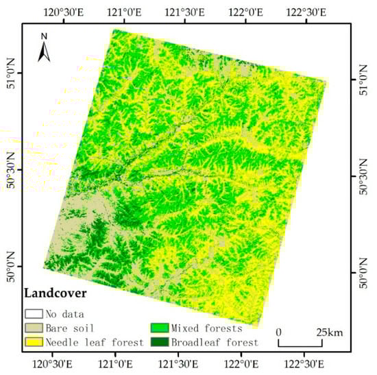The study area was located on the west slope of the Great Khingan Mountains (GKM) extending from northeast to southwest (between 120°23′ E to 122°40′ E and 49°32′ N to 51°15′ N) with elevations ranging from 1100 m to 1400 m (Figure 1). The cold temperate continental monsoon climate led to an annual average temperature of this region as low as −5.0 °C, with maximum and minimum temperatures of 32 °C and −48 °C, respectively. The precipitation of this region was generally unevenly distributed within a year, with about 80–90% of the total annual precipitation (around 400–500 mm) occurring from June to August. The number of days with snow cover was around 200 days, and the growing season lasted 80–100 days. These climate conditions gave this area the typical boreal temperate forest. The forest cover of this region was up to 62% with dominant tree species as Dahurian larch (Larix gmelinii), Mongolian Scotch pine (Pinus sylvestris L.), white birch (Betula platyphylla) and aspen (Populus davidiana).