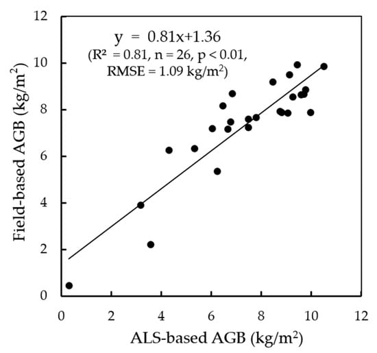 - We built the stepwise regression model with the field-based forest AGB as a dependent variable by inputting various ALS-based canopy metrics including nine canopy percentile heights, mean height and plot density (Table 4) as independent variables. It was found that the canopy mean height did a good job in predicting the variations in field-based forest AGB with the linear regression model as AGB = 0.826 × hm − 3.208 (R2 = 0.83, n = 26, p < 0.01, RMSE = 1.09 kg/m2).
