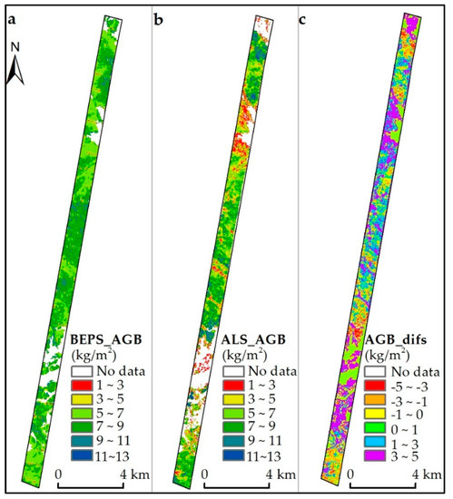 The cross-comparison between the predicted forest AGB and the ALS-based forest AGB of 2012 (Figure 6a,b) found that the consistent spatial distribution pattern could be observed in both forest AGB maps. The areas with high or low values of forest AGB from the BEPS-based AGB map could also be observed in the ALS-based estimates. However, the ALS-based AGB tended to over- and under-estimate the results obtained using the BEPS-based method in the high- and low-AGB areas. From the AGB differences map (Figure 6c), we found that most of the differences were between −3 kg/m2 and 3 kg/m2 except in areas where tree height was taller than 2 m.