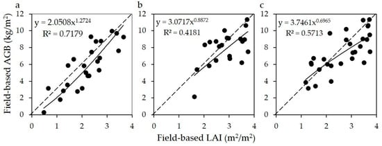The relationship between field-based LAI and AGB. Inset (a–c) represented needle leaf, broadleaf and mixed leaf forests, respectively.