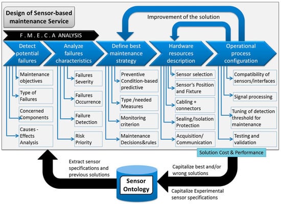 To enable a sensor-based maintenance strategy, engineers from multidisciplinary domains interact to select the optimal solution for maintenance service design and implementation. The maintenance is designed according to the characteristics of the target production system and its context of use as specified by the customer [21]. Thus, engineers need methods and tools to consistently manage the huge quantity of shared information during the design and implementation processes of the maintenance strategy.
