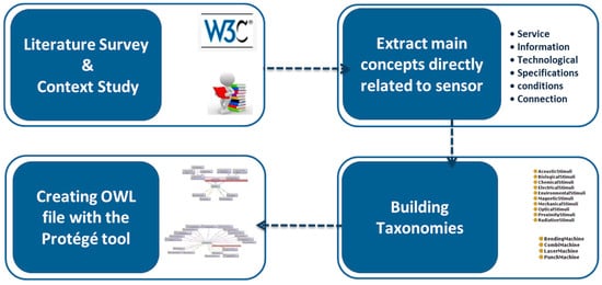 The proposed ontology is developed with an operational perspective based on a literature survey and analysis of the project’s functions (Figure 2). The first step for ontology building is the analysis of engineering practices during the design process in terms of knowledge and information exchange. Then, the sensor ontology is created based on the literature survey and commercial information to capture the domain knowledge and currently developed ontologies about sensors [31]. Using related handbooks and the W3C Semantic Sensor Network Incubator Group (SSN-XG), we extracted the elements, features, and characteristics of sensors. These elements are extended and classified to connect sensor specification to different facets of maintenance service design and implementation. SSN uses the “Stimulus-Sensor-Observation ontology design pattern”, which is a “generic and reusable component for all kinds of observation-related ontologies” and “introduces the key classes and their relations such as stimuli, sensors, and observations” [32].