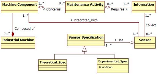 To build the generic sensor ontology, the global meta-model is extended and all concepts which have a direct effect on the sensor are extracted, connected, and classified. This allows for the identification of all ontology classes. Then, the relationships between classes are identified to form the final ontology structure. At the meta-level, as shown in Figure 4, the main classes heading the ontology structure are: Industrial machine, maintenance activity, information, sensor, and sensor specification. The sensor specification can be theoretical as defined by the sensor provider or experimental coming from real tests in specific conditions. For the genericity issue, the concept of maintenance activity is substituted to the concept of maintenance and maintenance service to focus on the operational level.