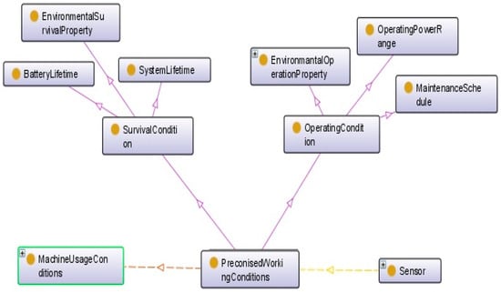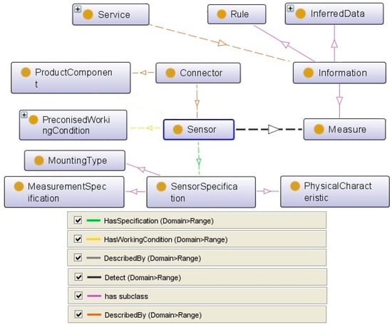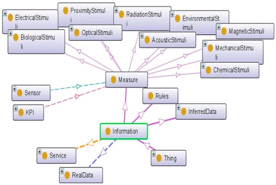 For more details, the ontology is extended by including taxonomies of main concepts that have direct connection to the class sensor. For instance, each maintenance activity is defined by various information, namely: (1) measurement data collected from sensors; (2) rules supporting the interpretation of collected data regarding the characteristics of the business domain of interest (e.g., safe or hazard range); and (3) inferred data representing the results of the application on one rule Also, “Measurand” and “Stimuli” are defined as “detectable changes in the environment” [32] that “trigger the sensor” [33]. From the technological point of view, each sensor measures a special event. The classification of measurement types supports the rapid identification of the main attributes according to the measurement domain. This will help engineers to correctly introduce new sensors in the knowledge repository and as a result, identify more easily the best sensors at the conception stage (Figure 9).