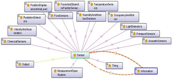Using a sensor’s expert knowledge, the first step in the description of the sensor ontology is the classification of variety of sensor types. Each sensor is described by its input–output and its measurement specifications (Figure 6). This taxonomy is extracted from commercial portals and guidelines from sensor handbooks. This taxonomy is useful to extract the technical pre-defined specifications that suppliers or manufacturers provide in the sensors’ datasheets.