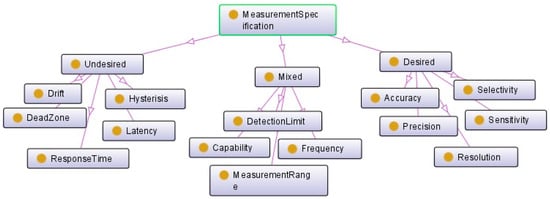 A sensor may have some measurement capabilities describing the “capability of the sensor in various conditions” [35]. The measurement specification class can provide an indication about these capabilities. It describes the sensor’s operation range, which can be used in KPI (key performance indicator) as well as sensor selection. This will help the connection of sensor to the related categories of information for the rapid identification of suitable sensors for one maintenance activity. Three types can be distinguished based on the connection of their key indicators to the final performance of the sensor, namely: desired, undesired, and mixed (Figure 8). The first category includes the key indicators of the sensor’s measurement performance. The second one presents all factors that can reduce the performance, for example, the presence of dead zone or a high response time. The mixed indicators are the capacity, frequency, detection limit, and measurement range of the sensors. These indicators provide necessary information to choose the best sensor for different situations. For the same usage, the desired and undesired specifications indicate the weaknesses and advantages of each sensor.