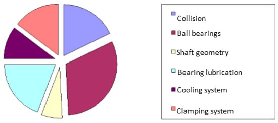 In accordance with the sensor implementation process proposed in Figure 1, the study began with an FMECA. Around 250 diagnostic reports at spindle disassembly were analyzed and expert meetings were conducted. Every spindle failure mode was analyzed. Severity, occurrence, and potential detection of the failure or its cause led to a priority risk number. The main critical spindle component was revealed: it is the high precision ball bearings (Figure 11).