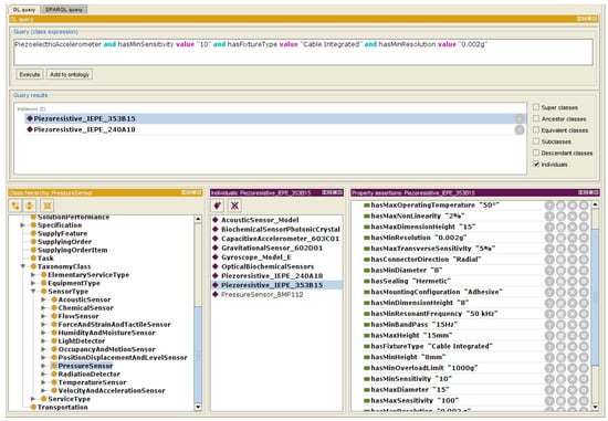As shown in Figure 12, the query is created according to the Table 1, which has been given by the machine’s engineers. As an example, one simple query is defined as “PiezoelectricAccelerometer and hasSensitivity value “10” and hasConnectorType value “Cable Integrated” and hasResonantFrequency value “70 kHz””. The Protegé retrieves two related sensors and shows the complete specifications. The engineer can choose the best sensor from the retrieved list.