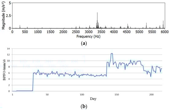 Example of frequency spectrum from a daily vibration signature of spindle (a) and evolution of ball pass frequency outer race (BPFO) monitoring criterion during 220 days (b).