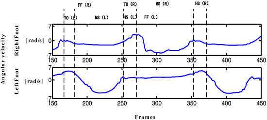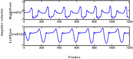 Amplitude variation of angular velocity in walking (1 frame = 0.017 s).