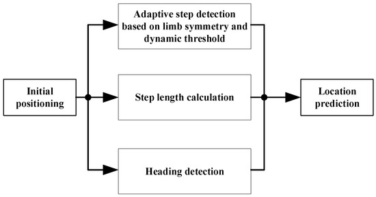 and respectively represent the current position and the previous position coordinates, respectively; is the step length, and represents the heading value. The improved PDR algorithm proposed in this study is shown in Figure 3: