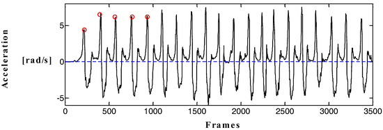 The zero crossing method [14] and wave peak detection method [15] are two kinds of step detection methods. Owing to the presence of errors and the inevitable jitter in human motion, steps are misjudged by the traditional zero crossing method, making it difficult to detect the true steps accurately, as shown in Figure 4. A constant threshold value is set in the wave peak detection algorithm. The steps will be counted when the acceleration exceeds the threshold. Figure 4 illustrates that the human body is not in an absolutely uniform state during the course of motion, and the peak acceleration of each complete gait range is not fixed. Therefore, the peak detection method cannot accurately calculate the true number of steps. In view of the shortcomings of the traditional step detection method, this study proposes a new step detection method based on human motion characteristics and dynamic threshold to improve the accuracy of step detection. The inertial data in the process of walking show that the angular velocity of the left and right feet presents a certain periodicity and symmetry, and the features of angular velocity curves around the Y-axis is particularly evident. Therefore, to increase the accuracy of step detection, the traditional step detection method is improved based on the characteristics of the angular velocity of the Y-axis.