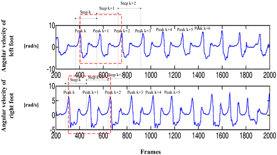 Figure 5 shows the change in angular velocity amplitude of the Y-axis. Step detection threshold should be constantly changing and continuous because walking is continuous. At the same time, the threshold of the current gait range is set according to the amplitude of the angular velocity curve of the previous three steps. The dynamic threshold can be calculated using Equations (2)–(4). In Equation (4), is the mean magnitude of the angular velocity of the previous three steps, and are the peaks of the i, i + 1, and i + 2 steps, respectively.