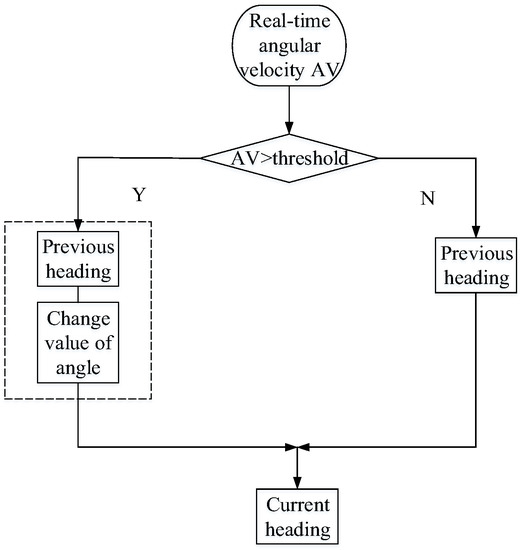 To eliminate the noise caused by the movement of the leg jitter, the angular velocity threshold is set in the heading detection to determine whether the heading has changed effectively. In Figure 7, when the current angular velocity is greater than the threshold, the course is assumed to have changed, and the current heading is calculated by adding the previous course with the integral of the angular velocity. When the current angular velocity is less than the threshold, then the heading has not changed effectively, and the previous heading will be still used.