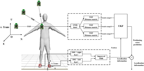 The basic architecture of the combined positioning system and the navigation coordinate system (n coordinate) and the carrier coordinate system (b coordinate) used in this work are shown in Figure 9. The integrated positioning system used by the algorithm is mainly composed of two parts: PDR and UWB positioning systems. Among these positioning systems, the IMU placed on the left foot and right foot obtains the pedestrian motion information through the built-in accelerometer, gyroscope and magnetometer. Then, the improved PDR algorithm is used to obtain the real-time position and travel trajectory of the pedestrian. The UWB positioning tag placed on the shoulder of a pedestrian calculates the distance between the positioning tag and the base station by measuring TOF data between them. On this basis, using UKF [18,19] is used to fuse the position information calculated by IMU and the pseudorange information measured by the UWB tag, so as to realize the accurate real-time indoor positioning of pedestrians.