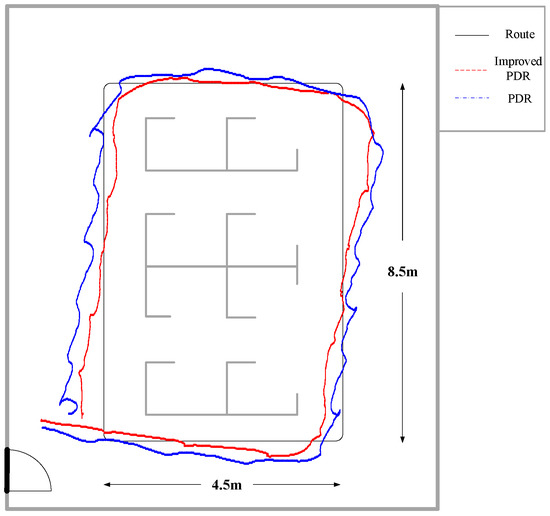 Figure 10 shows the comparison of localization results between the traditional PDR and the improved PDR algorithm in this paper. The test site is a laboratory 11.7 m long and 7.5 m wide. The black curve in the figure represents the walking trajectory, which is a rectangle 8.5 m long and 4.5 m wide. The blue curve represents the traditional PDR trajectory, and the red curve is the predictive trajectory of the improved PDR algorithm proposed in this work. The positioning accuracy of this method is improved by 20% compared with the traditional PDR algorithm, an improvement that can provide the positioning accuracy of approximately 51.25 cm, as shown in Table 2.