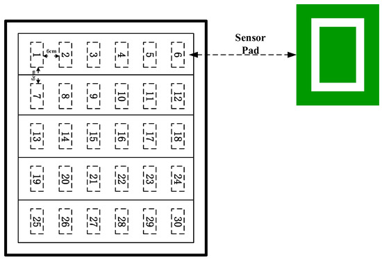 In the test, the capacitive sensing module is arranged in a grid format, and each module is connected by a CAN bus (Figure 18). Each capacitor chip has its own number and marks the coordinates of each chip. When the pedestrian walks in the area, the reference system can quickly locate the coordinates of the pedestrian. When the pedestrian passes through the capacitance induction module, the capacitance sensing chip quickly senses the foot action, and calculates the location of the pedestrian according to the positioning algorithm. The distance between each capacitor sensing chip determines the positioning accuracy of the positioning reference system. In this work, a spacing of 6 cm is selected, and the positioning accuracy can meet the precision requirements of the positioning reference system. At the same time, the module keeps the clock synchronized with the indoor positioning system, and the dynamic coordinates calculated by the capacitance induction module and the proposed indoor positioning are compared to verify the performance of the dynamic positioning method.