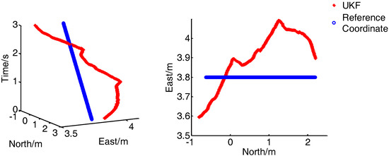 Figure 20 presents the comparison of the real-time position between the combined positioning system proposed and the reference system when the walking speed is 1 m/s. In the left figure, the X and Y axes represent the position of the pedestrian, and the Z axis represents the time. As shown in the diagram, under the normal walking speed, the integrated navigation system can continuously and stably output the pedestrian position, and has excellent dynamic performance and high positioning accuracy.